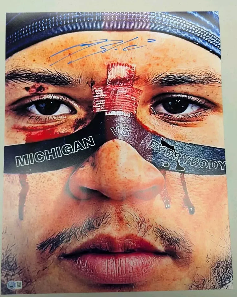 Autographed 16x20 of University of Michigan Legend Blake Corum. Photo has Beckett Certificate of Authenticity. This was signed in person in our store.