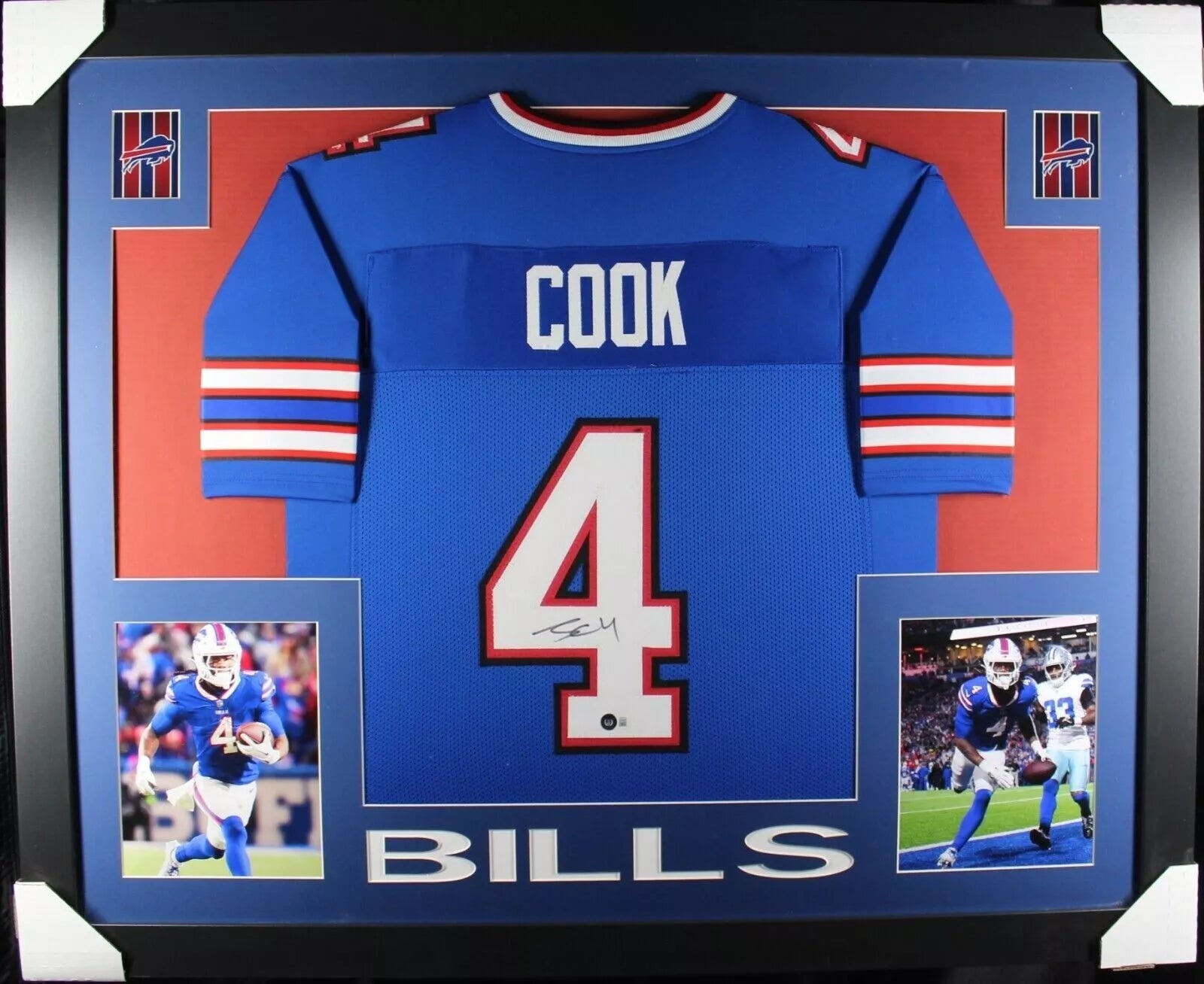 James Cook Signed Custom Blue Jersey hand signed and authenticated by Beckett. This jersey has been custom framed. The frame measures 35x43 and includes double mating and UV protected acrylic. This is the perfect addition to any Bills Fans Collection.