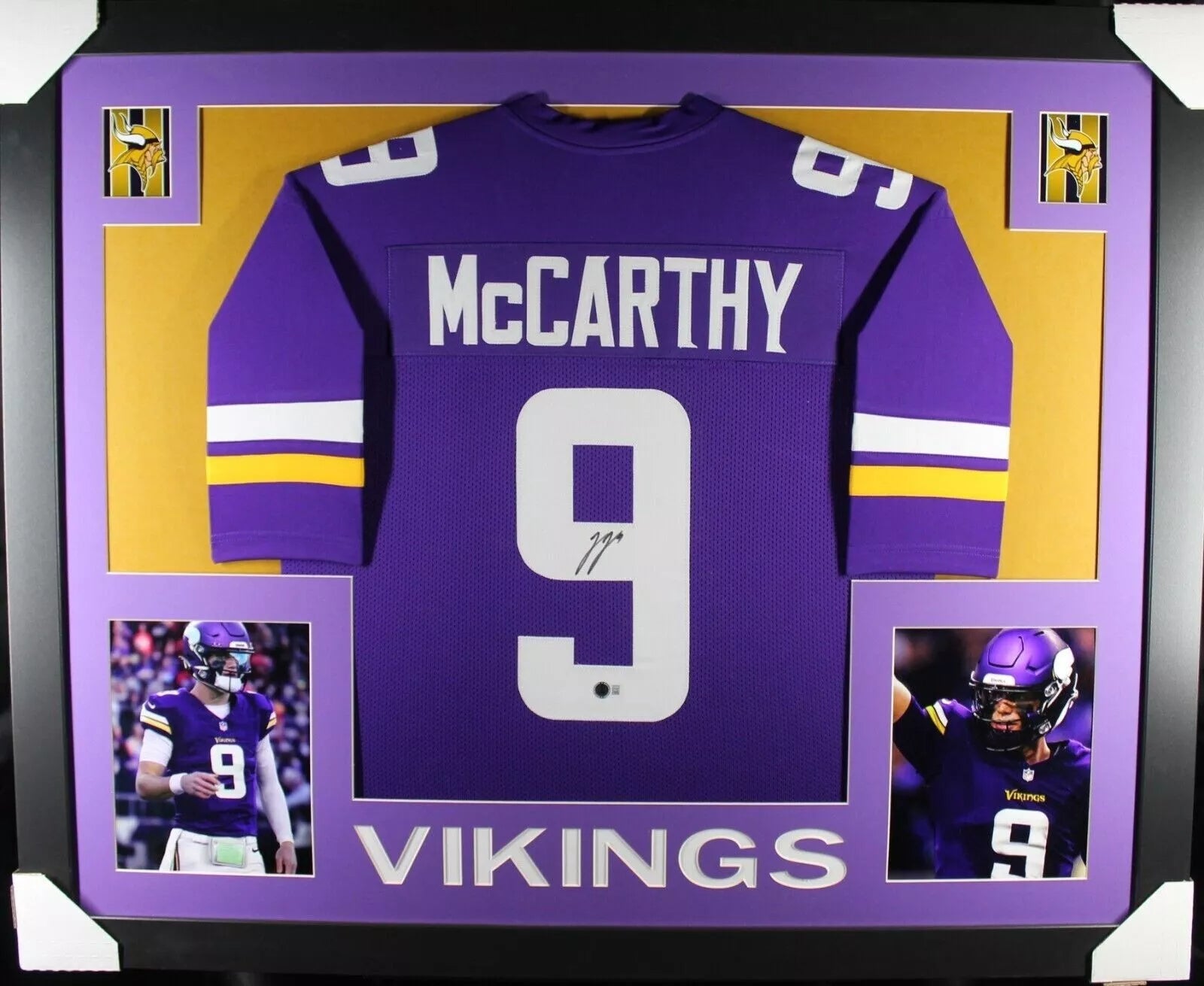 This is a unique opportunity to own a piece of sports history. A custom jersey signed by JJ MCCARTHY, the former quarterback for the Minnesota Vikings, is framed and ready to be displayed. The jersey is authenticated by Beckett Authentication Services (BAS) and comes with a certificate of authenticity. This item is perfect for any football fan or collector of sports memorabilia. The jersey is a size 35x43 and features the Beckett refinements. Don't miss out on the chance to add this rare item to your collection.