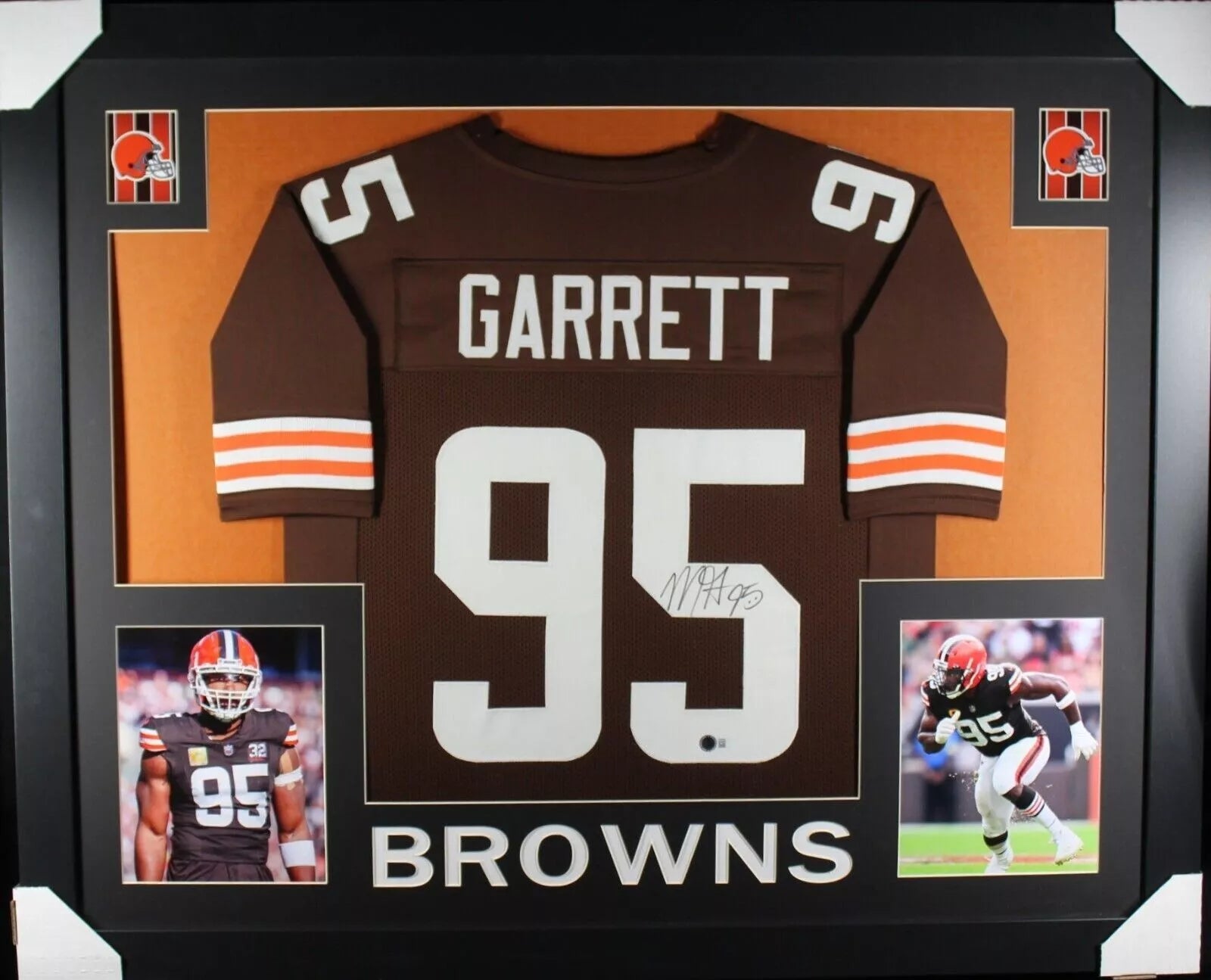 Myles Garrett Signed Custom Brown Jersey hand signed and authenticated by Beckett. This jersey has been custom framed. The frame measures 35x43 and includes double mating and UV protected acrylic. This is the perfect addition to any Browns Fans Collection.