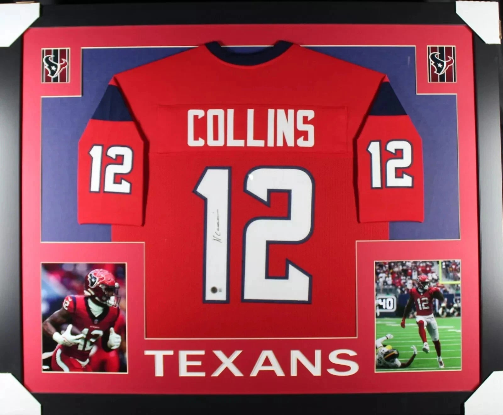 Nico Collins Signed Red Custom Jersey authenticated by Beckett. This jersey has been custom framed. The frame measures 35x43 and includes double mating and UV protected acrylic. This is the perfect addition to any Texans Fans Collection.