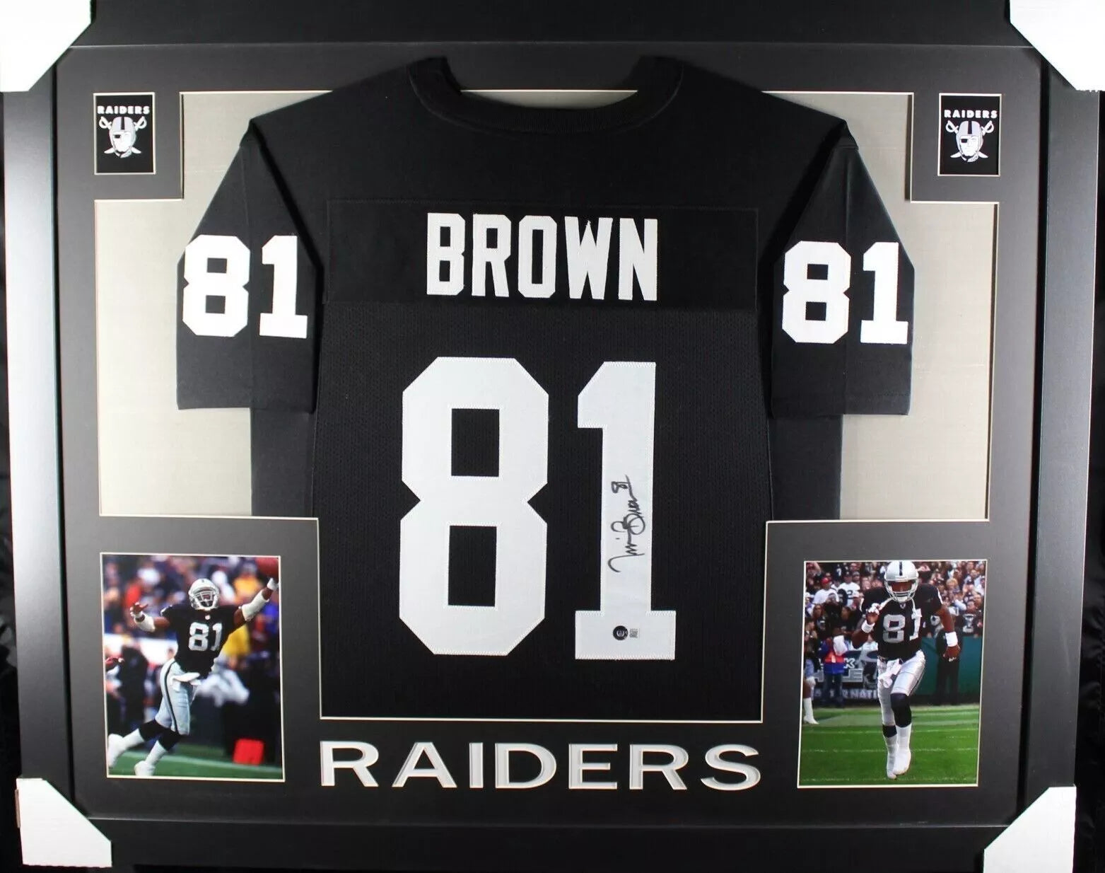 Tim Brown Signed Black Custom Jersey authenticated by Beckett. This jersey has been custom framed. The frame measures 35x43 and includes double mating and UV protected acrylic. This is the perfect addition to any Raiders Fans Collection.
