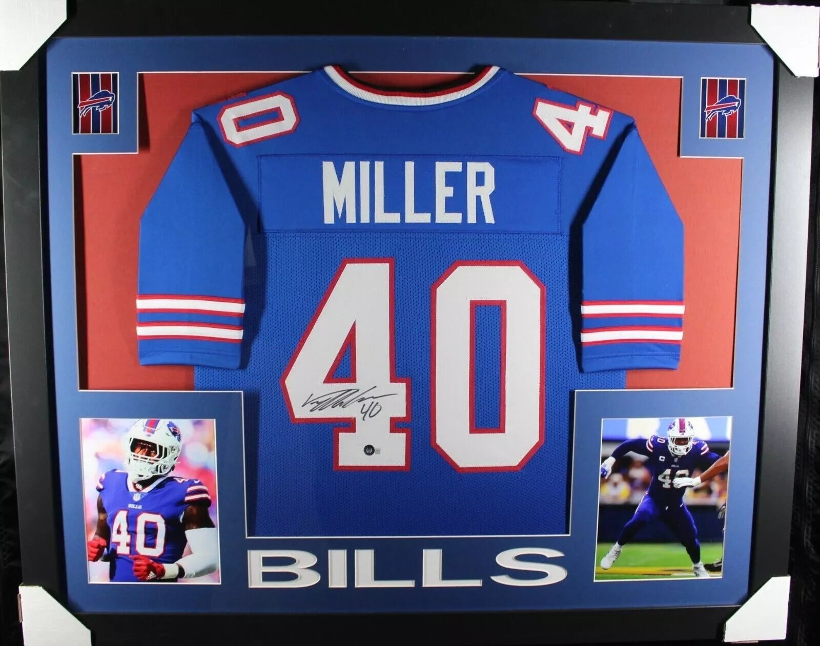 Own a piece of NFL history with this custom jersey signed by Von Miller, one of the league's top players. The jersey comes beautifully displayed in a 35x43 frame, making it the perfect addition to any sports memorabilia collection. Authenticated by Beckett Authentication Services (BAS), you can be confident in the authenticity of this one-of-a-kind piece. Show off your love for the Buffalo Bills with this featured refinement jersey frame. Don't miss out on the opportunity to own this original, autographed jersey.
